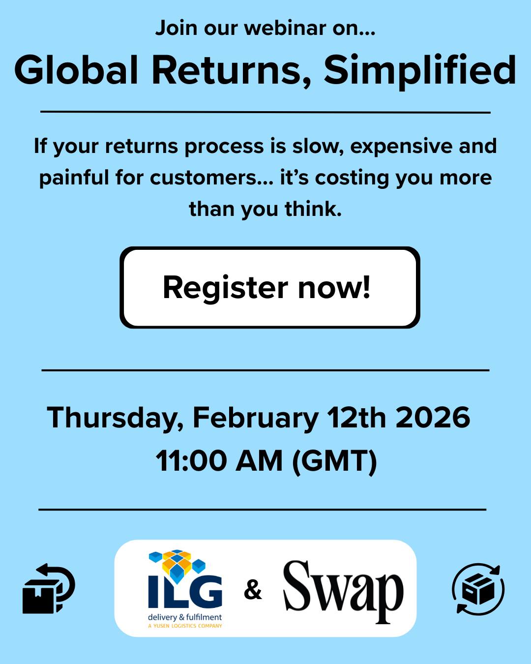 Global returns are messy. In this live webinar, ILG and Swap cut through the complexity of reverse logistics to reveal what’s really happening behind the scenes and how smarter technology, tighter routing and fewer handoffs can turn returns from a costly challenge into a powerful driver of customer loyalty. ↩️ Join Sam Taylor, Customer Services Director at ILG, and Max Wilkinson, Senior Partnerships Manager (Logistics) at Swap, on the 12th of February at 11:00am GMT for a practical, no-fluff session packed with actionable insights you can apply immediately. Returns. Make them work for you. Register today from the link in our bio. #GlobalReturns #ReverseLogistics #Fulfilment #3PL