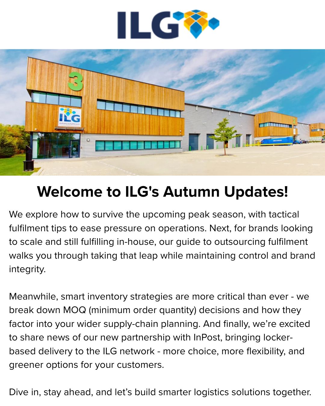 Autumn Updates from ILG 🍂 From uncovering what’s really keeping ops teams awake at night in the run-up to Peak, to exploring the benefits of outsourcing fulfilment for Indie brands, this edition is packed with insights to help your brand scale smarter. We also delve into MOQ and it’s impact on your supply chain strategy, and share exciting news about our partnership with InPost, bringing flexible, more sustainable locker deliveries to our network. Dive in and stay ahead this Peak Season. ⬇️